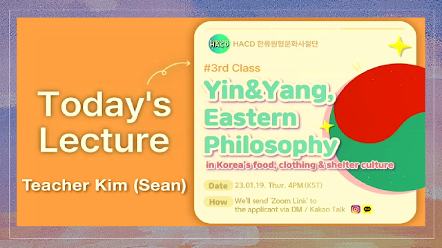 Following several days of preparation, we meet again on the third session for Season 1 Lesson 3 and the lesson topic that we discussed is about Yin&Yang, Eastern Philosophy in Korean Food, Clothing, and Shelter Culture. It's encouraging to see how committed all of the participants are to continuing to attend our free lessons for everyone; we believe they are enjoying and appreciate the learning experiences that we provide for them. In this lesson for the third week of our regular meeting, Teacher Seok Kim was selected as the lecturer for the class topic; he is one of the organization's greatest teachers and interpreters. So, with the most active engagement of our participants, we effectively filled week 3 with understanding and a lot of energy Most of the time, we noticed our participants taking notes on essential and insightful teachings, and they always provided excellent feedback afterwards the session was over.